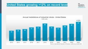 “The United States has one of the most advanced manufacturing industries worldwide,” says Marina Bill, President of the International Federation of Robotics (IFR). “The first IFR outlook on preliminary results shows again strong robotics demand across all major segments of U.S. manufacturing in 2023.”
