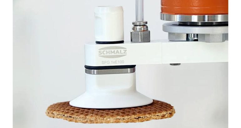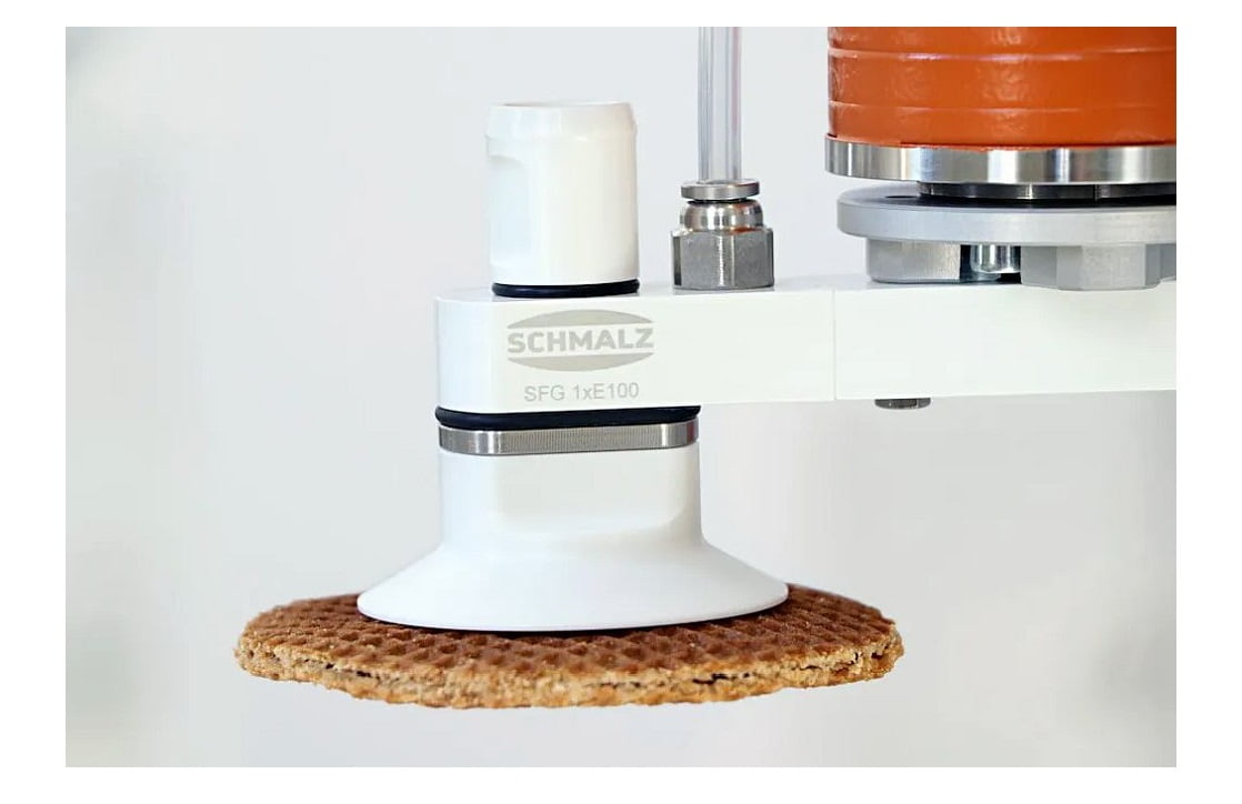 Schmalz is presenting the modular SFG flow gripper at Anuga FoodTec. Specially developed for handling dry food products, the contact element made of FDA-compliant silicone gently picks up sensitive products such as waffles. The gripper fully complies with the hygienic design specifications. Thanks to its compact and lightweight shape, the SFG supports highly dynamic processes.